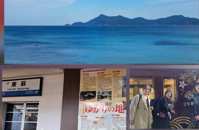 | 絶景ポイントでは列車は停止してくれます。 乗客には萩焼のぐい呑みをプレゼントしてくれました。 |