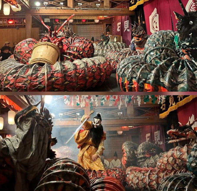 | 三宮神社での演目は天岩戸と大蛇。 日本神話でも有名な“(ヤマタノオロチ)退治”を題材にした「大蛇」。 17メートル近くの大蛇がスサノオを相手に火花を散らしながら暴れるシーンは迫力満点です! |