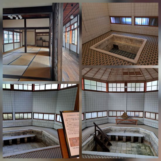 | 楼門を入ったところには現在の公共浴場がありました。 現在使用されている温泉施設の建物としては、日本最古のもの(明治9年に建築)。 高い天井と広い浴槽で、レトロな浪漫が漂う温泉情緒豊かなお風呂です。 今回はタオルを持参したので日帰り温泉を楽しみます。単純アルカリ性の美肌の湯でした。 |