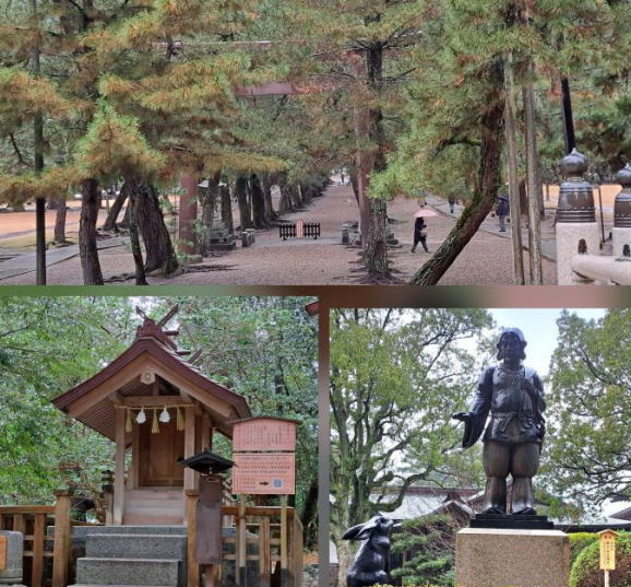 | まずは祓社ご挨拶、松の参道を歩くとムスビの御神像と因幡の白兎像が出迎えてくれます。 | ||