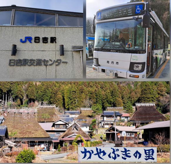 | 7:02発 豊岡〜(山陰本線)〜9:51着 日吉 10:10発〜(南丹バス600円)〜11:06着 かやぶきの里 |