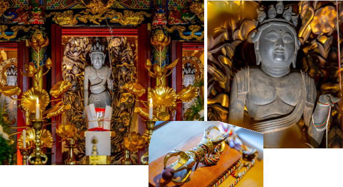 | 本尊の木造十一面観世音菩薩立像は、毎月18日に御開帳されるので、その日にお参りができました。 本尊の左手と結ばれた「御手綱」の端を五鈷杵(ごこしょ)に取り付け、触れられるようにしていました。 |