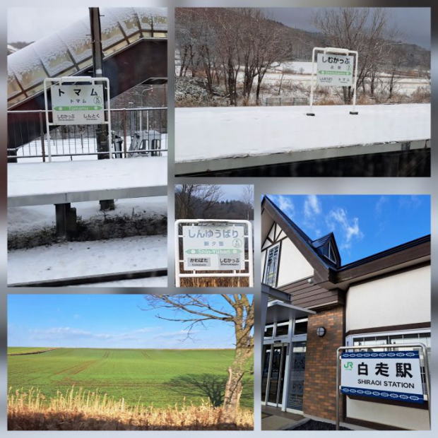 | 4日目、帯広に泊まった翌日は峠を越えて、白老駅で下車。 馬の放牧や牧草地や畑を見ながら白老駅に着きました。 |