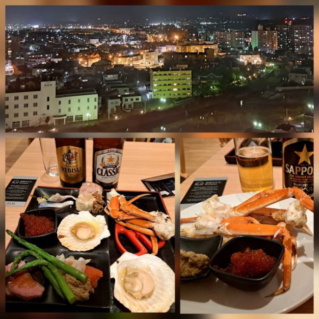 | 函館の夜景も見えて、夕食も豪華です。お刺身などが数多く並んでいましたが、 いくら(ますこ)と蟹味噌を盛り放題。ズワイガニも帆立も美味しい♪ たくさんの種類の料理が並んでましたが、2回戦も同じもの(^。^)y-.。o○。痛風祭り |