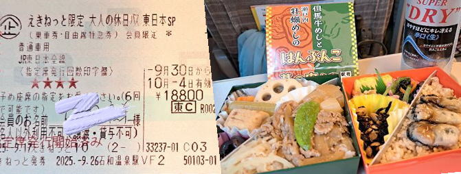 | いつも通りに 熱海駅で東海道線のグリ−ン車両に乗って東京駅へ。 駅弁屋祭で駅弁と缶ビ−ルをおときゅう割引で買って、新幹線へ乗車。 さあ、いざ東北へ〜 |