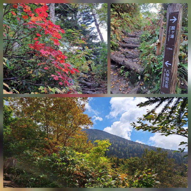 | 避難小屋で休憩をした後、酸ヶ湯温泉方面に向かいました。樹林帯をぐんぐん 下っていくと平地に出ました。振り返ると八甲田山の山々と草紅葉 |