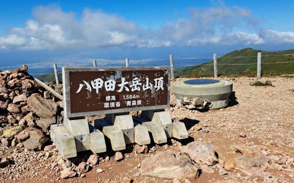 | 12:10 酸ヶ湯温泉から2時間半、大岳山頂に到着しました。 展望はバッチリですが、風が強いので、ここで寛いでいる登山者は居ませんねぇ。 |