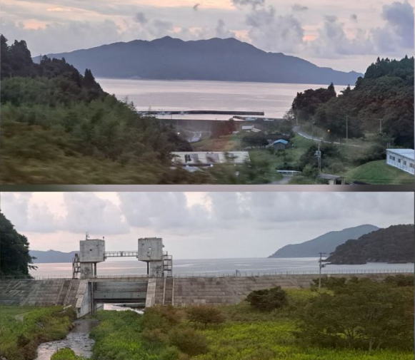 | 復興の様子、今の三陸海岸の景色を静かに眺めることができました。 水門の上に三陸鉄道の車両のデザインに似た建物が・・・。 いったい何だ??? |