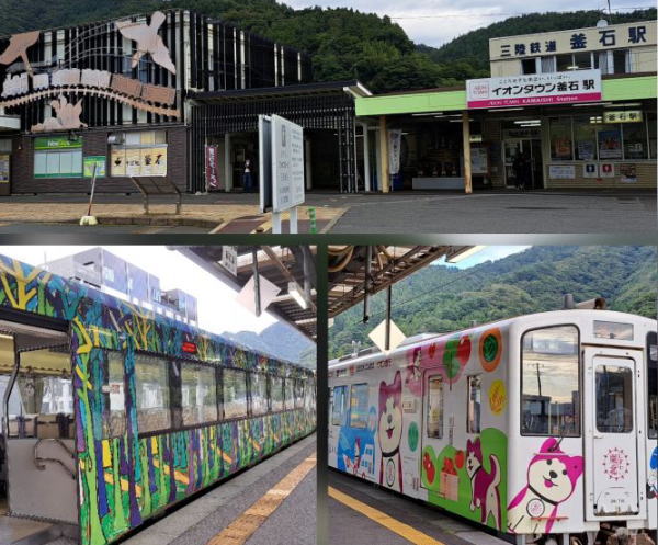 | 盛駅でJRのBRTから三陸鉄道リアス線に乗り換えました。三鉄は震災直後から一部区間で 運転を再開し、沿線住民には大きな心の支えとなっていたことでしょう。 現在はすべての区間が開通していて、全路線乗り鉄が可能になりました。 三鉄は乗って楽しいラッピング列車がいっぱい。4人掛けでテ−ブル付きの車両もあります。 |