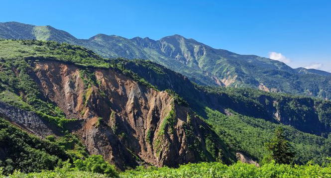 | マツムシソウやハクサンフウロ、シャジンなど、百花繚乱で下るのが勿体ない・・・。 観光新道は尾根を歩くので終始眺めが良く、砂防工事が行われている谷筋も見渡せました。 |
