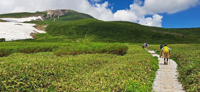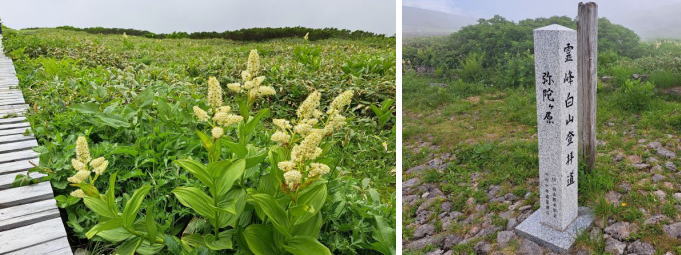 | 木道の先には御前峰が見えます。コバイケイソウも咲いています。 | ||