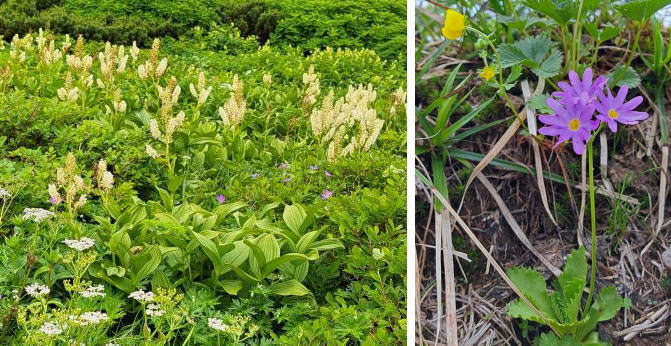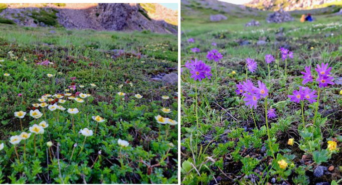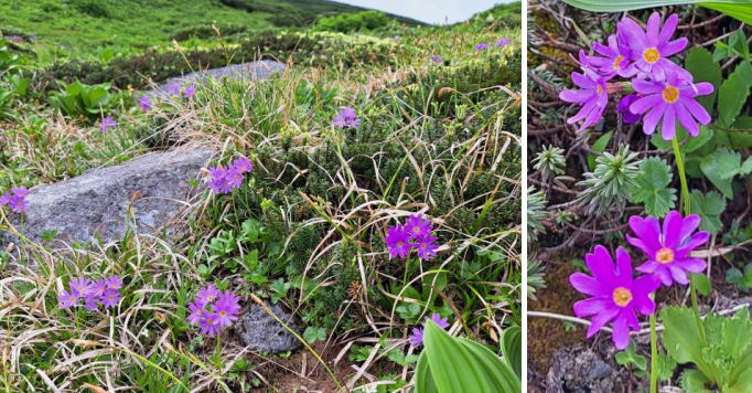 | 雪解けが遅かった場所にはアオノツガザクラ 。イワカガミもちらほら | ||