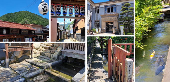| 美濃市うだつの町並みから車で45分ほどで、郡上八幡です。岐阜県は暑い((+_+))。 夜は郡上踊りで賑わうだろうけど、昼間も人出が多いです。水辺を散歩して、明日用に朴葉寿しをゲット。 |