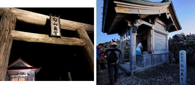 | 白山2日目の朝は、室堂から御前峰を見ると、中腹にヘッドライトの光が続いています。 いつもは南竜でテント泊だったから、南竜から室堂に登るのも1時間以上かかる為、 山頂でご来光を拝むことはありませんでした。 室堂に泊まればご来光が叶うわけだ♪♪ 私達も朝4時前に出発。 |