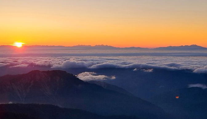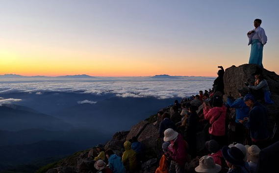 | 神主さんも登られて、ご来光を待つ間になんと山の説明もしていただけました。 御嶽山や乗鞍岳、遠くには北アルプスの山々も見えています。 |