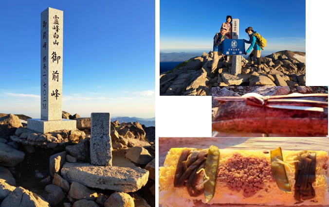 | 初めてのご来光でしたが、いつもの御前峰 ここで朝弁当を広げました。竹皮に包まれた酢飯がとても美味しく、朝でも食欲が増すなぁ。 |