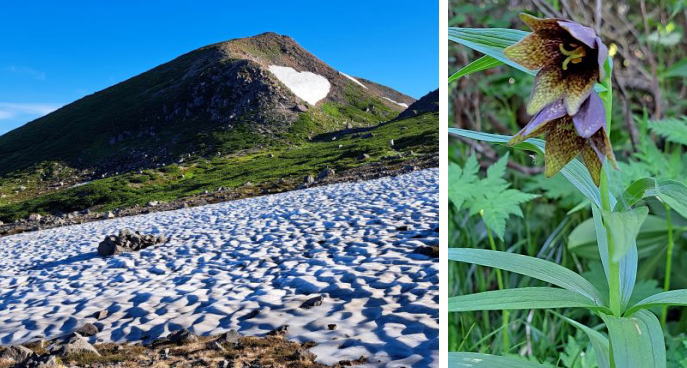 | 大汝峰にハート形の残雪 ハクサンシャクナゲの花を見て、時々クロユリも見て室堂に戻ってきました。 |