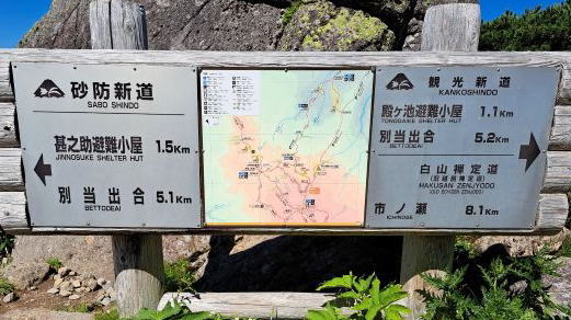 | 甚之助避難小屋から30分弱で南竜方面への分岐に出ます。 いつもはこの分岐から南竜のテント場に向かっていましたが、今回は室堂まで登ります。 室堂まではエコーラインを登りたかったけど、土砂崩れで通行止めになってしまったので 黒ボゴ岩コースにしました |