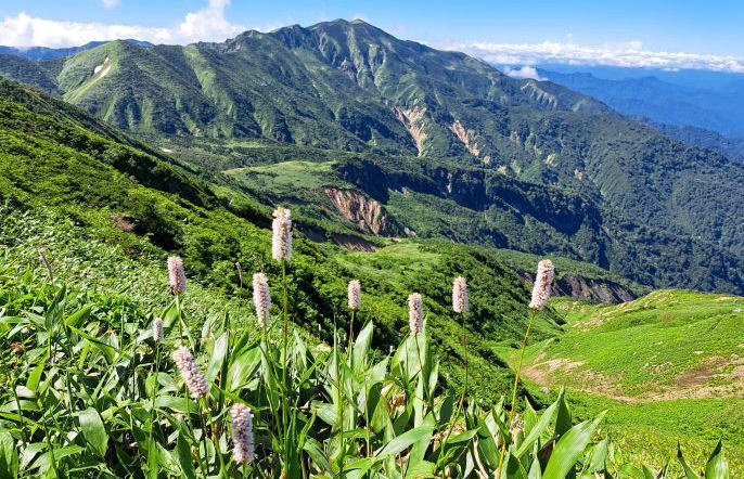 | イブキトラノオと別山 観光新道という名前だけあって、展望が良く、観光気分で歩けますね〜。 |