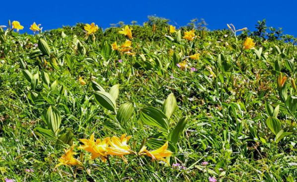 | ずっと以前から、観光新道はお花が多いと聞いていたので、やっと今回その確認ができます。 なるほど、花!真っ盛り!! このあたりはニッコウキスゲがいっぱい咲いています。 |