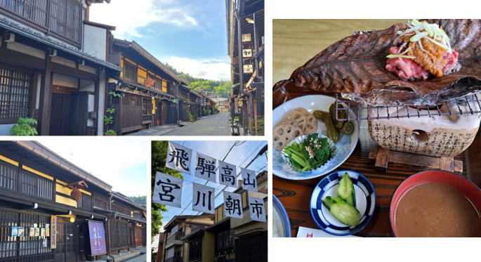 | 高山の古い町並みを歩いて、朝市のハシゴをします。 宮川朝市は外国人も多く、賑わっています。 いつもの赤かぶのきざみ漬けも買えたし、次はかじ橋食堂。 ここは朝早くからやっていて、飛騨牛朴葉 |