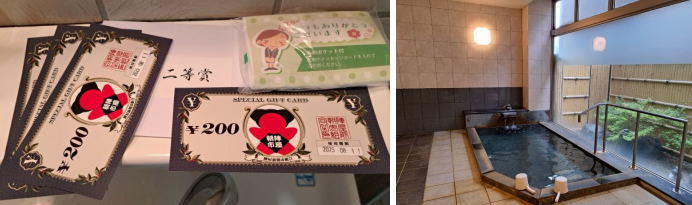 | くじを回したら、3等と2等が出て、全部で800円分のお買い物券が当たって大万歳!。 金券を持ってもう一周(といっても10数軒)朝市をまわり、お得な買い物ができたぞぉ〜。 ホテルに戻り、最後にもう一度温泉に入り、10時前に、チェックアウト。 これから道の駅めぐりをしながらのんびり帰ります。 |