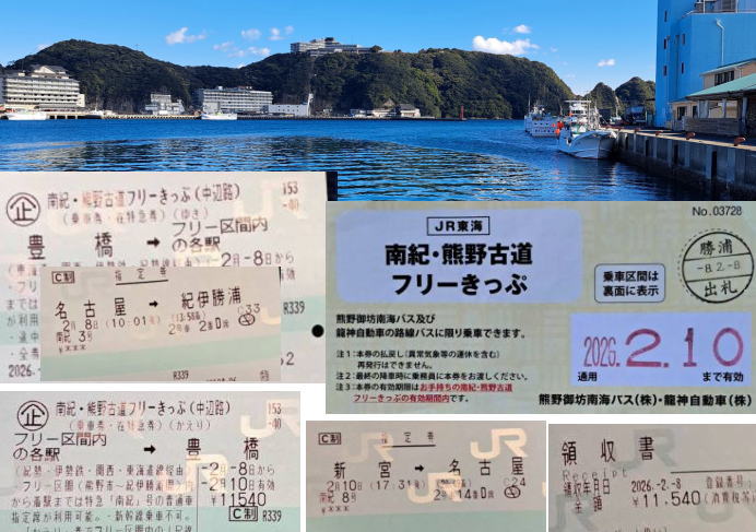 | 6:19発 起点〜豊橋(フリ−きっぷ購入)〜10:01発 名古屋〜(南紀3号)〜13:58着 紀伊勝浦駅 | ||