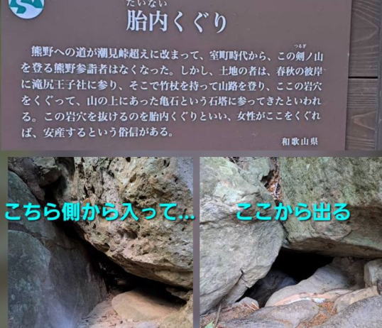 | 歩き始めはどこも急傾斜です。10分ほど登ると岩穴があります。 この岩穴を抜けるのを『胎内くぐり』といいます。よかったわぁ〜♪なんとかくぐれました。 |