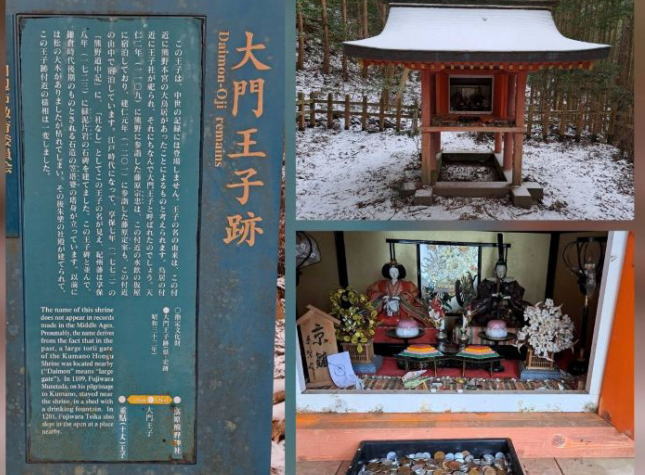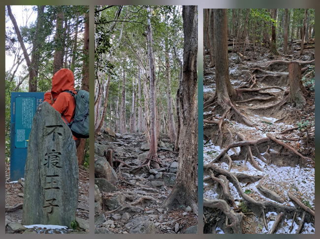 | 胎内くぐりの先も急な石畳の道を登っていくと不寝王子がありました。 ここでは中国人らしい先客が3名。この後は東南アジア系の2組が通り過ぎただけでした。 ゆるゆると古道歩きが続きます。標高が上がってくると昨日の雪が残っていました。 |
