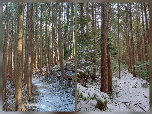 | 高度が上がってくると、昨日の雪が残っています。 こんなに静寂で霊験あらたかな古道をたったひとりで歩いているのって、贅沢な時間です。 |