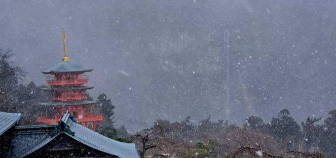| 青岸渡寺の先の展望台からの景色が好きですが、 雪が降っているので三重塔越しの那智の大滝は見えないなぁ〜 |