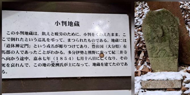| 悲しい言い伝えの小判地蔵は小さな小さなものでした。 この地に住む人が哀れんで建てたものらしく、熊野に住む人々の優しさに触れました。 |