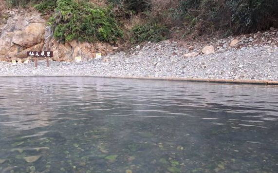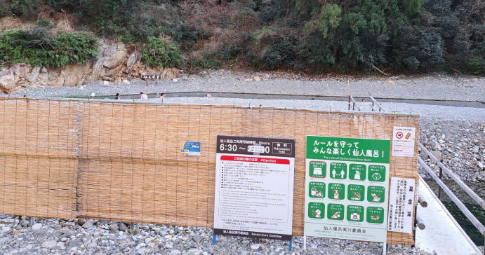 | 午後3時に宿に戻ったので、宿の温泉と仙人風呂をいったり来たりしよう。 昨日は真っ暗だった仙人風呂の全景です。よしずの向こうに大塔川が流れています。 橋を渡って砂利道を進むと、その先が川を一部分せき止めて作られた仙人風呂になっています。 |