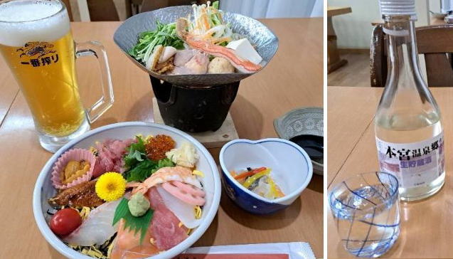 | 温泉のはしごの後、まずは部屋飲みタ〜イム♪ たくさん歩いたから缶ビールも最高♪♪ 宿の選べる夕食はリ−ズナブルに海鮮丼と寄せ鍋にしました。お供のお酒も生ビ−ルも美味しかったあ |