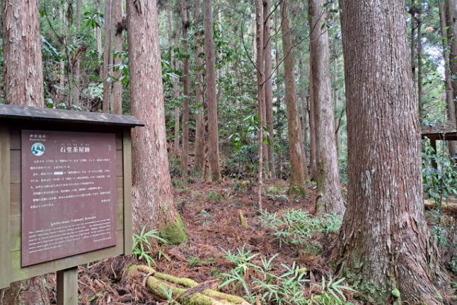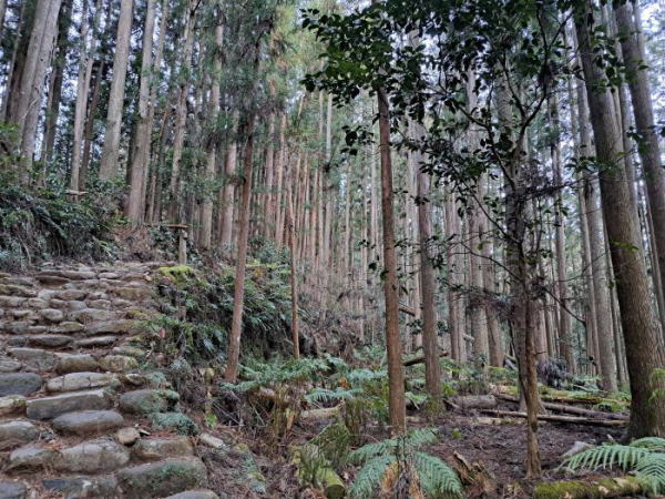 | 熊野古道には道しるべが至るところにあるので、安心して歩けます。 熊野古道らしい杉林と石畳。凍結した池の横を歩き、石畳の道を歩いていきます。 |