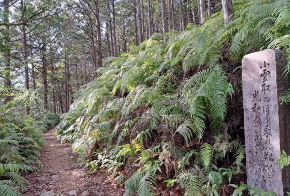 | 平坦な道だったり 石畳の登りだったりと、急坂を登りきると桜茶屋跡がありました。 小雲取越えの中で一番標高が高い桜峠の近くに位置します。この先には休憩に最適な東屋があり、 初めて登山者とすれ違いました。この時間ならきっと大雲取越えも出来そうなペ−スでした。 |
