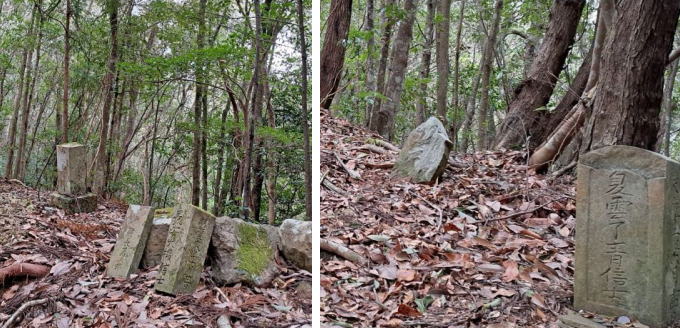 | 松畑茶屋跡周辺は、生活の場があったことが偲ばれ、その周辺には墓石もありました。 これから先は下ったり、平坦な道だったりを繰り返し・・・ |