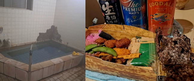 | まずは大塔川の仙人風呂に入ってきました。宿で水着とダウンコートを借りられるのが有難い。 再び宿の温泉に入ってから部屋呑みタイム。 勝浦で買った鯨の竜田揚げが美味しくてビールも進みます。 |